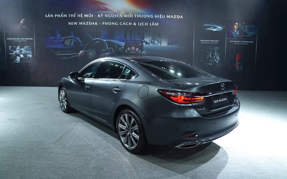 Đuôi xe New Mazda 6 nổi bật với cụm đèn hậu được tạo hình dày dạn, đi liền với nẹp biển số mạ crom ở giữa. Hai ống xả tròn cùng với cản sau được thiết kế hầm hố, giúp gia tăng nét thể thao cho tổng thể xe.