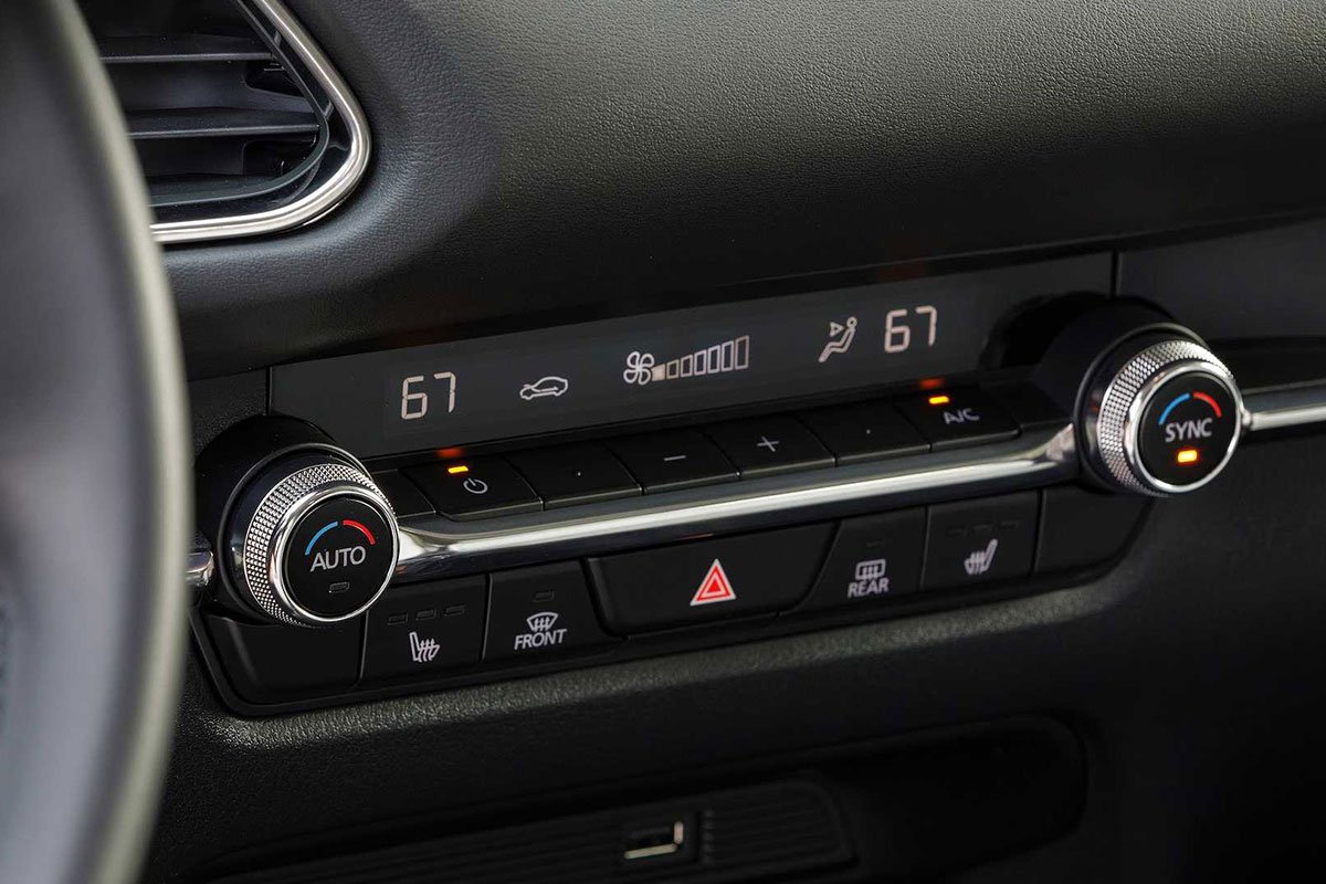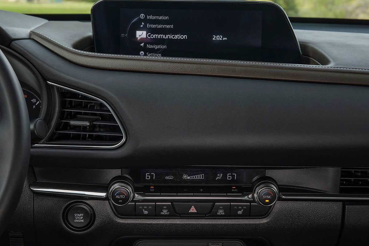 Các phiên bản của chiếc CX-30 đều được trang bị rất nhiều option để làm hài lòng khách trẻ. Xe sử dụng điều hoà tự động 2 vùng cho khả năng làm mát hiệu quả nhất.Ngoài ra khu vực hàng ghế sau còn sử dụng cửa gió. Hệ thống thông tin giải trí trên xe gồm: