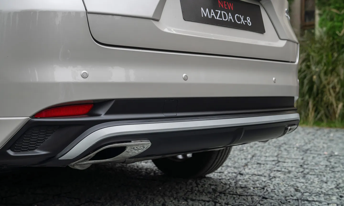 Thanh nẹp cản sau và viền ống xả crom góp phần hoàn chỉnh hình ảnh khỏe khoắn, sang trọng cho tổng thể Mazda CX-8 mới.